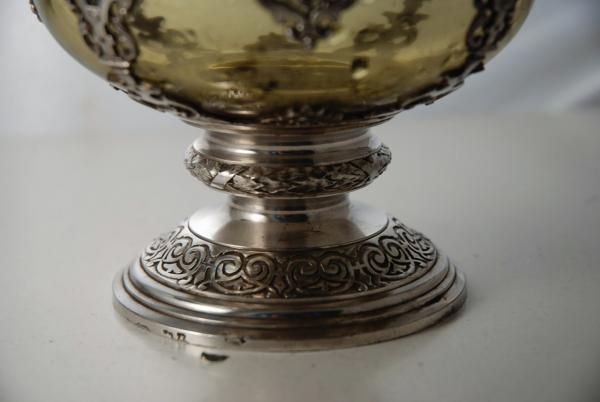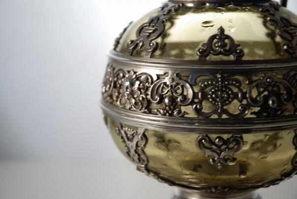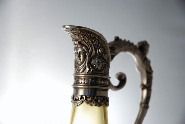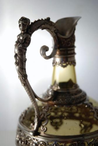 Heavily influenced by the Renaissance silversmiths, this style is often named after the great sculptor and silversmith Benvenuto Cellini; it is known as a Cellini jug. It is made of Rhineland glass and silver plate. The crispness of this decoration is really quite suberb, and the quality throughout is excellent.