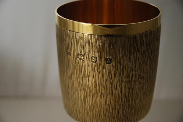 This stylish Post War silver cup was made by Gerald Benney in London 1973. It is of beautiful quality, bearing Benney's signature "Bark Effect" decoration. Unusually for Gerald Benney, it is silver gilt both inside and out. The base metal is, of course, Sterling Silver.