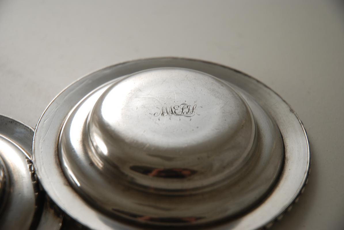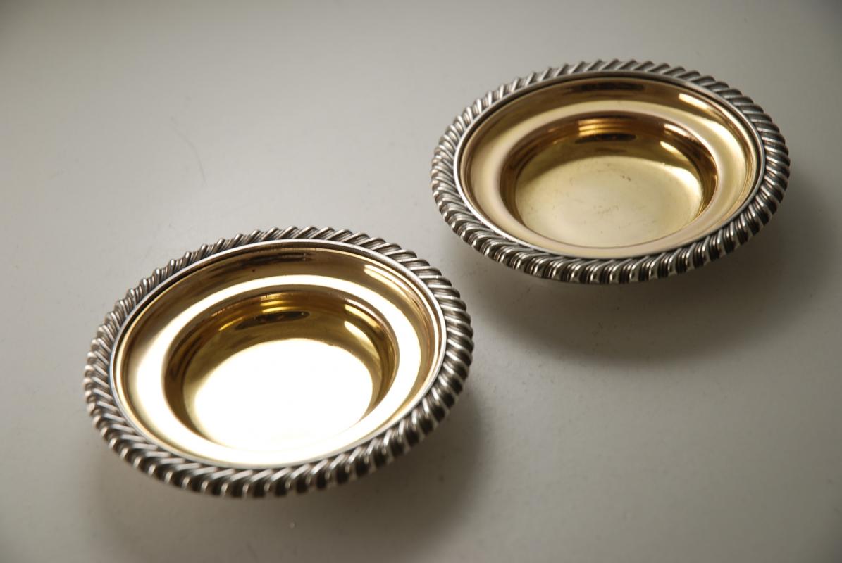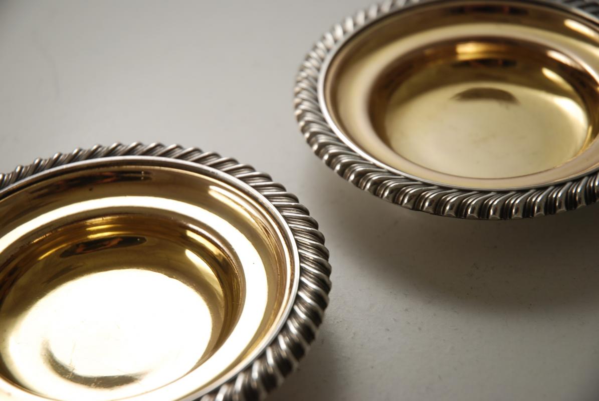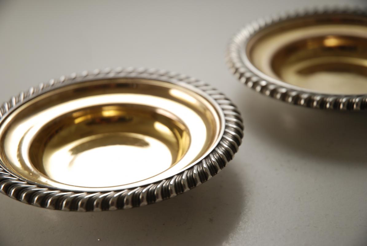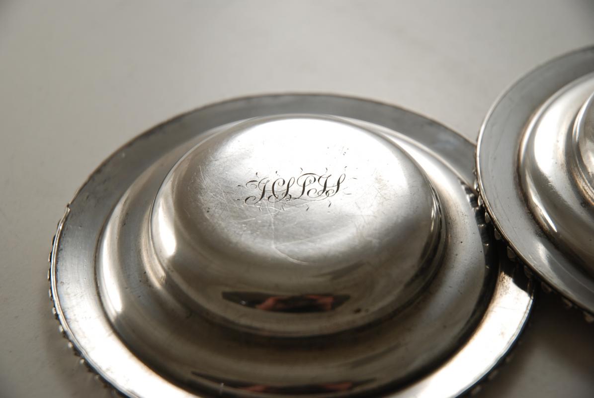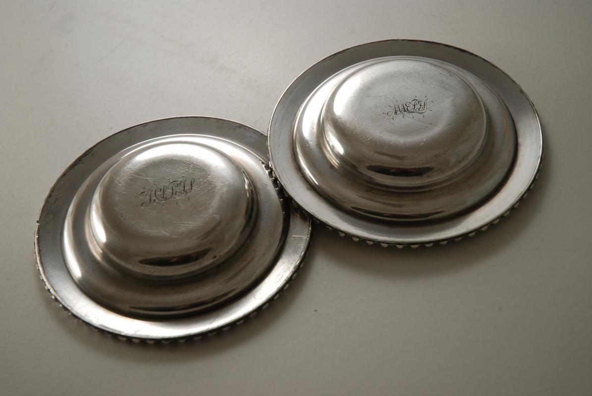 These old Sheffield Plate dishes are heavy, and of beautiful quality. They are circa 1805, fire gilt inside, while the borders are applied sterling silver. The gilding is in perfect condition, as are the salts in general. Each Old Sheffield Plate salt bears a set of engraved initials underneath.