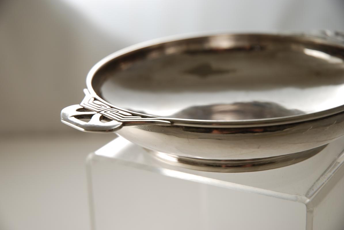 This Georg Jensen silver dish is hand raised with beautiful hammer marks in evidence throughout. The handles are high Deco, and quality Art Deco Sterling Silver like this is rare indeed.