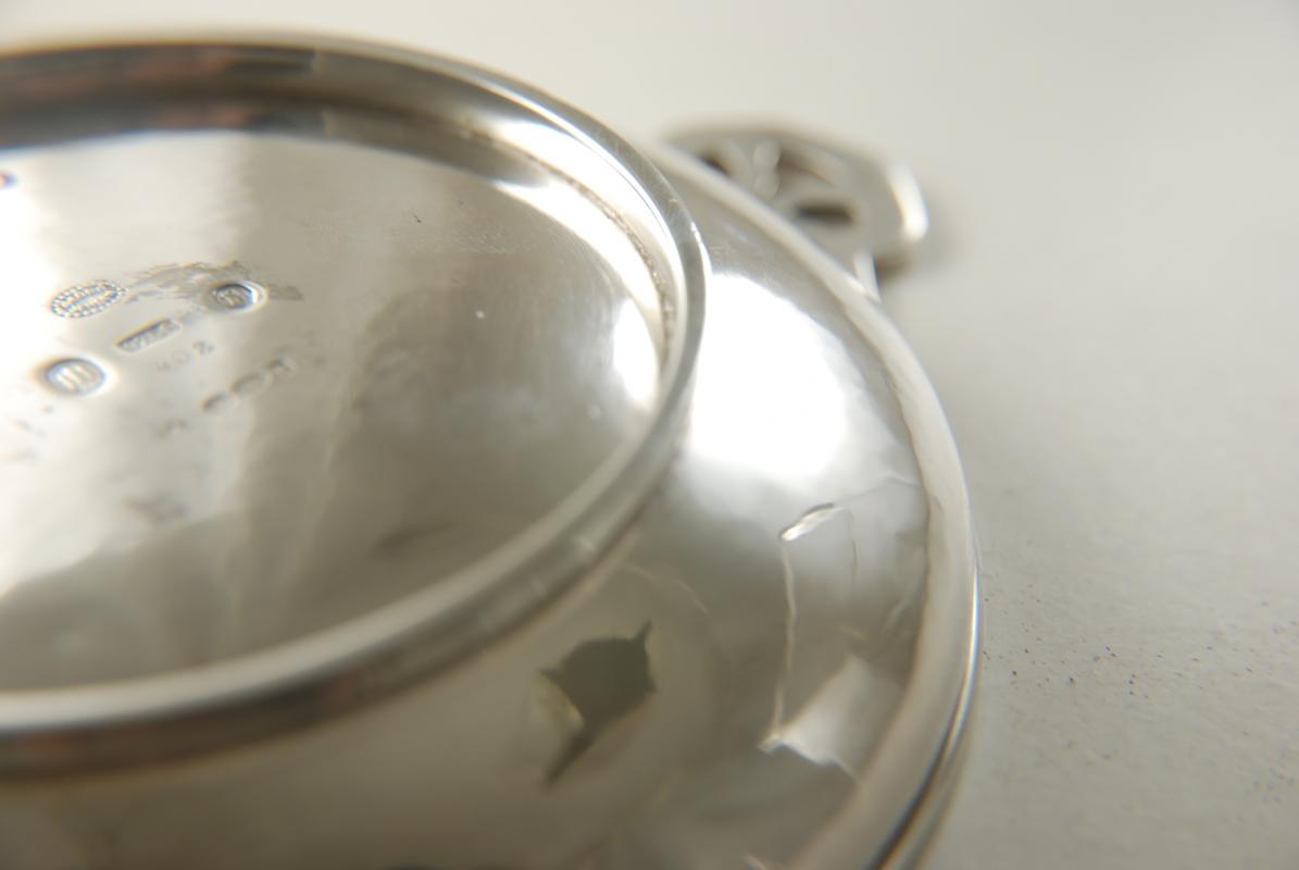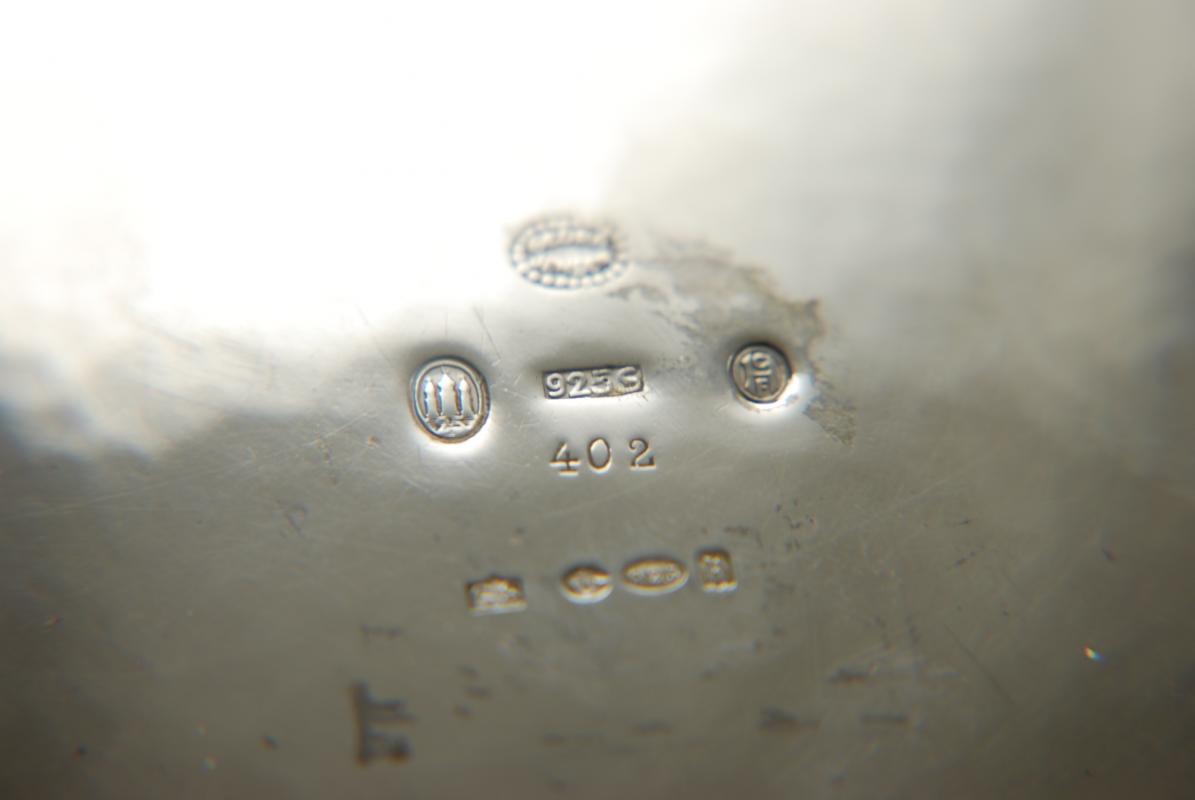 This unusual sterling silver dish was made by Georg Jensen in Copenhagen 1925. It is of excellent quality, heavy and beautifully made. It bears the design number 402, and has a full set of Danish hallmarks, Georg Jensen marks and also English Import marks for 1925. It measures 17cm from handle to handle.