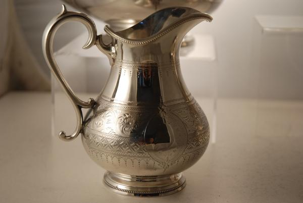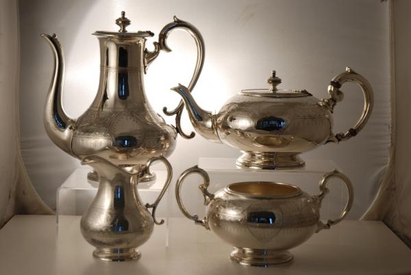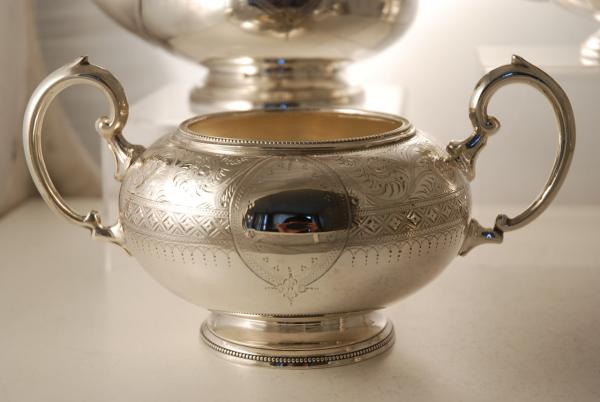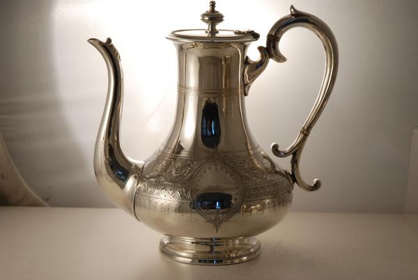 This, engraved, Victorian Silver Plate 4 piece tea set and tray were made c1870. The teaset, compriseing of a teapot, coffeepot, sugar bowl and cream jug, are all fantastically engraved and each is crisp and clear. The tray is not original to the set but matches in style and the engraving is an exact match!